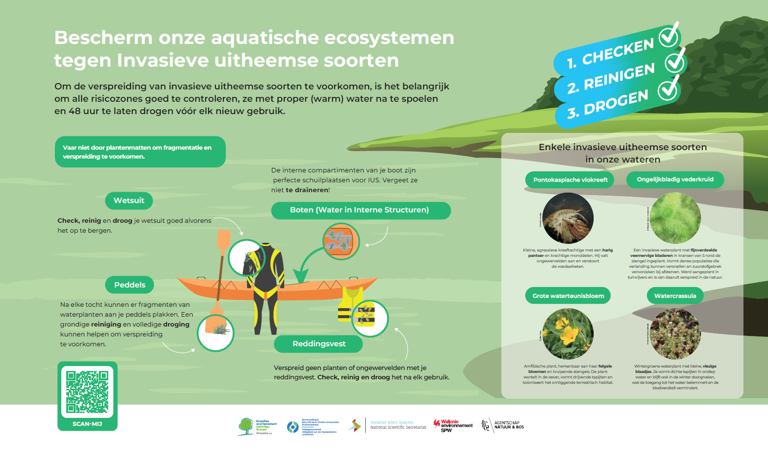 - CHECKEN: Controleer je boten, uitrusting en kleding na het verlaten van het water. Verwijder alles wat je vindt en laat het ter plekke achter.